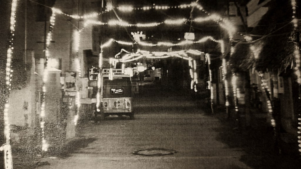 A body fell over to the side of a betel shop at the edge of the crowded lane leading to a commotion. When i turned my head back again, the old lady and her empathetic hand had disappeared. The women beside me seem middle aged like me, except every time the water reaches their feet, they break out into a peal of laughter like a gaggle of girls sharing a secret at the back of the school bus. They echo the faint but rapturous squeals that each wave carries back to us with it. In a distance beautiful bodies burst out of the darkness in the water. Women, children, the elderly. Each time we moved forward into the last of the dark, their fingertips touch each other’s in nervous excitement as a wave flows past them. It is the sea that tickles in its playfulness. You see, we have all lifted our saris so that we can feel the currents all the way upto our thighs. Lost in my curiosity, before i realise its happening, the water swells before me and rolls me over in its embrace. I gasp upwards for a breath and cough out the water that had filled up my lungs. I reach at the back of my head and notice that the jasmine has been stolen by the currents and the wig has come undone. My girl has carefully fixed the flowers to my hair after helping me to tie my sari and fix my blouse. She had folded away my shirt and trousers neatly into an old plastic bag, protecting them from the sand. I turn around and catch her looking at me. she is sitting on the beach with the old plastic bag on her lap, her smile now illuminated by the first silver of daybreak. Nearby, i hear the splashing of footsteps in the shallows. I look up and find her again, staring at me. She, the oldest women i had ever seen, her head thrown back in a chuckle. Her red saree drips a trail of vermillion behind her as she walks towards land. I watch the translucent sky with dimming stars as i lay back afloat and wait for the next wave to carry me further away in its embrace