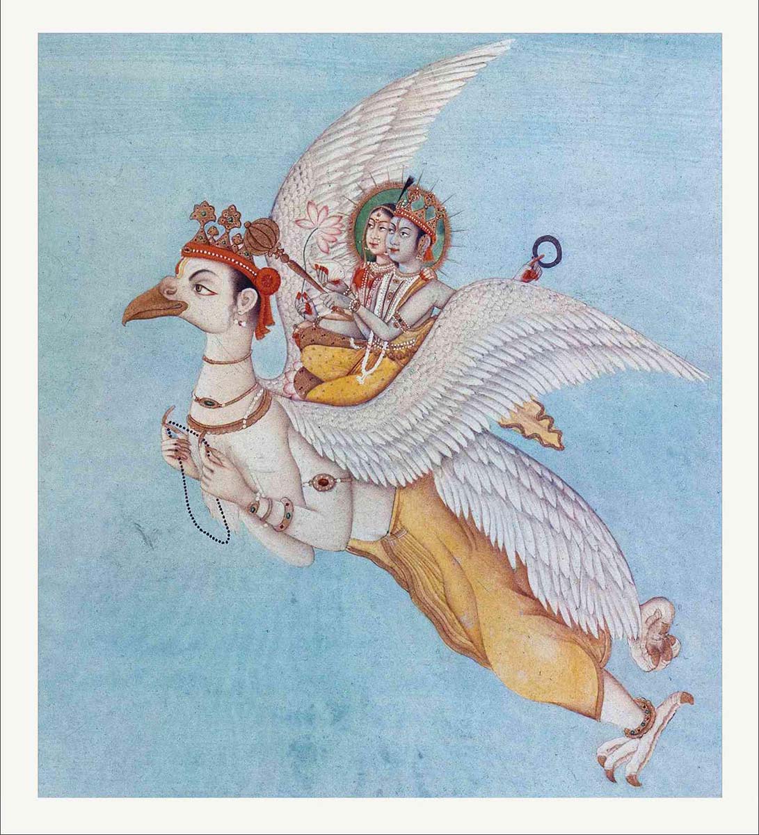 Lord Vishnu and Mother Laxmi on the legendary bird, Garuda.