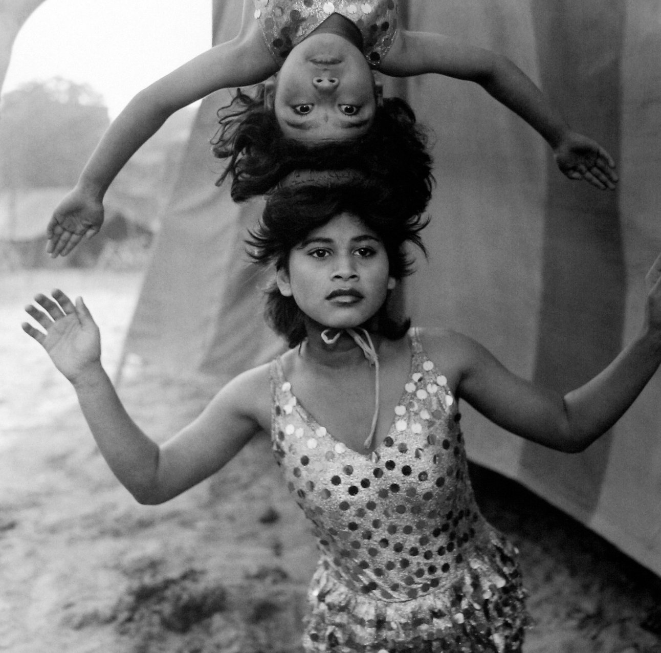 Bent but unbroken. A young contortionist of Great Raj Kamal Circus twists her body into an impossible shape. Beside her, little Sweety the I puppy sits still, a silent witness to a life of spectacle, and quiet loneliness. The circus is her stage, but where is her home? (1989)