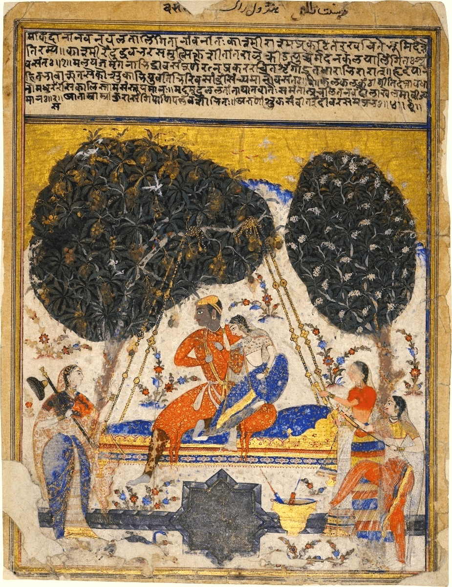 The god and goddess of eternal love, Kamadeva and Rati, were a lovely couple. Their affection for each other blossomed visibly during the spring season, and their companions included flowers, buds, cuckoos, parrots, honeybees and lush green trees.