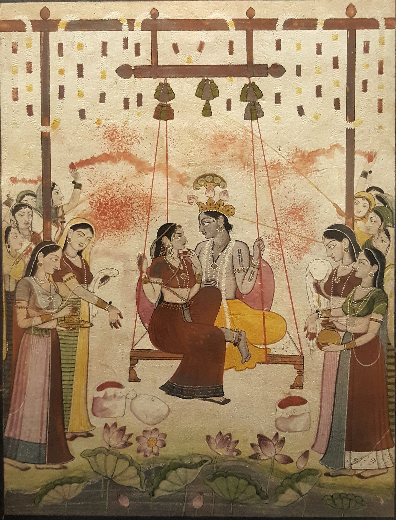 The two women on the right are spraying the lovers on the swing with coloured water from bamboo syringes (pichkaris)