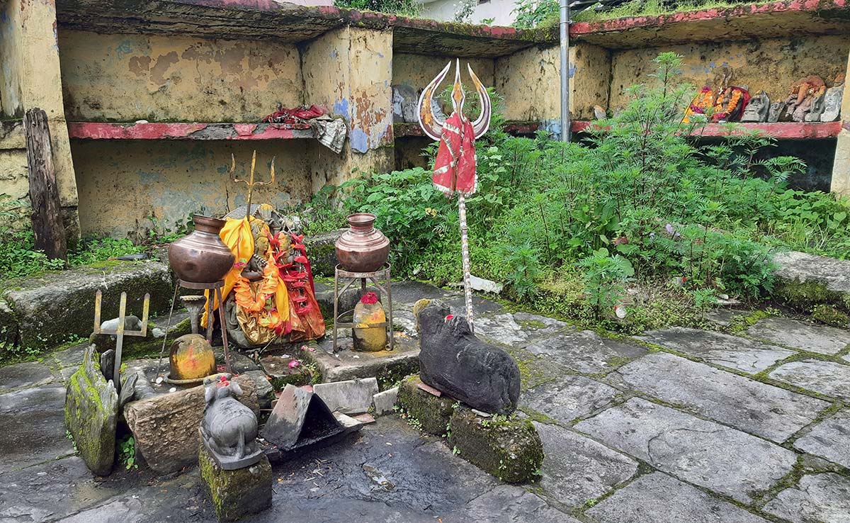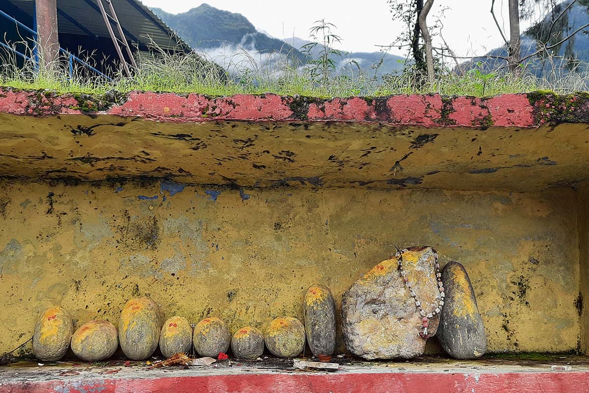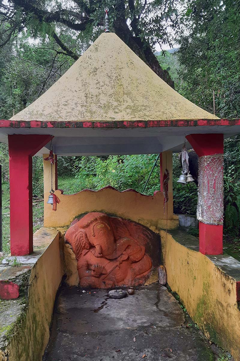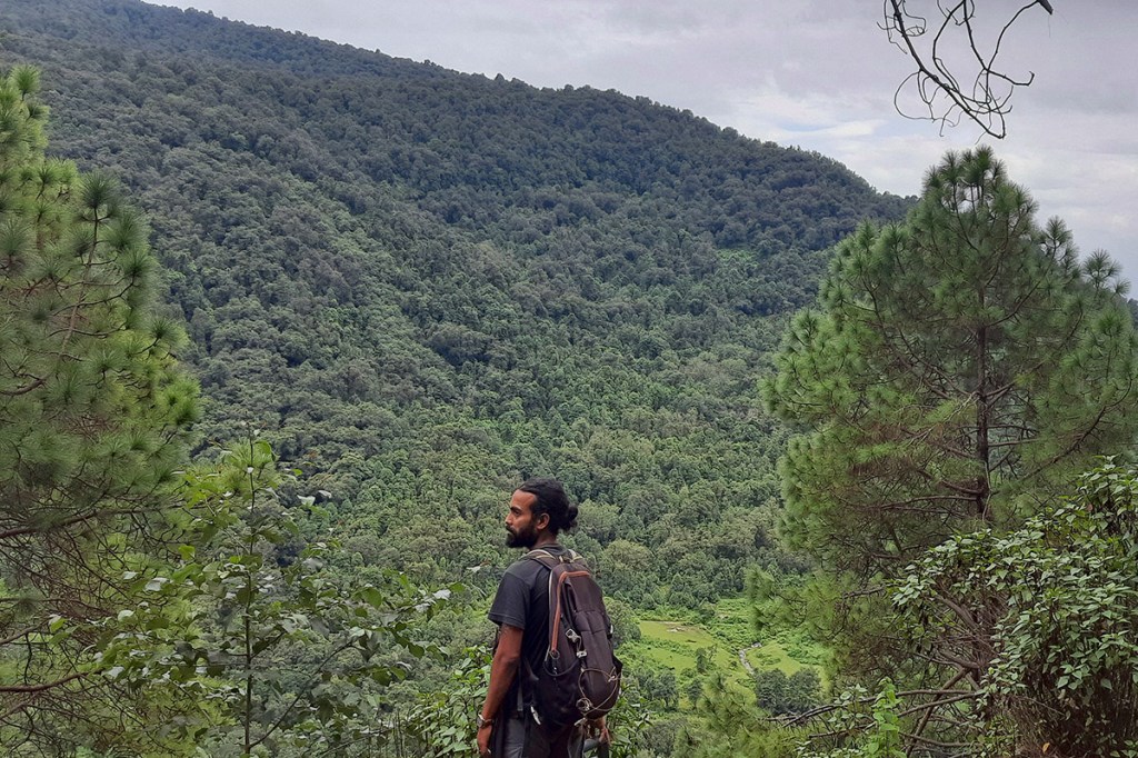 He is from a nearby village. He used to be very angry, used to drink a lot, abuse all day and beat people up on this road only, few months ago during a procession of a local deity, he kept kicking the drummer that walked in front of the deity, abusing all through the procession and threw the drum from the mountain. He passed out that night and since the next day he is out, yelling, crying, god knows what he eats, where he goes, please you can go from here. There is no need to panic or feel bad.
